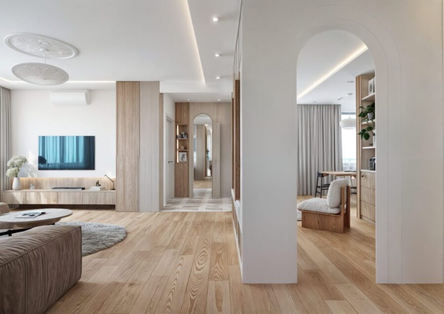 Projekt wnętrza apartamentu na ostatniej kondygnacji o podwyższonym standardzie. Sześcio-pokojowy apartament z kuchnią otwartą na część dzienną, zaprojektowany został w jasnej, beżowo – białej kolorystyce z elementami drewnianymi w nurcie japandi. Harmonijną i przytulną przestrzeń dopełnia oświetlenie.