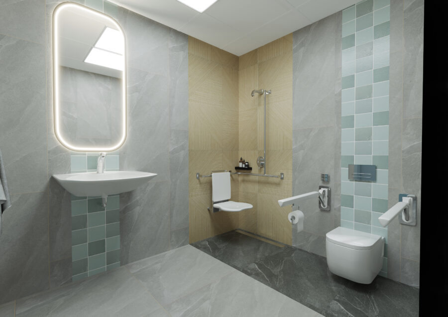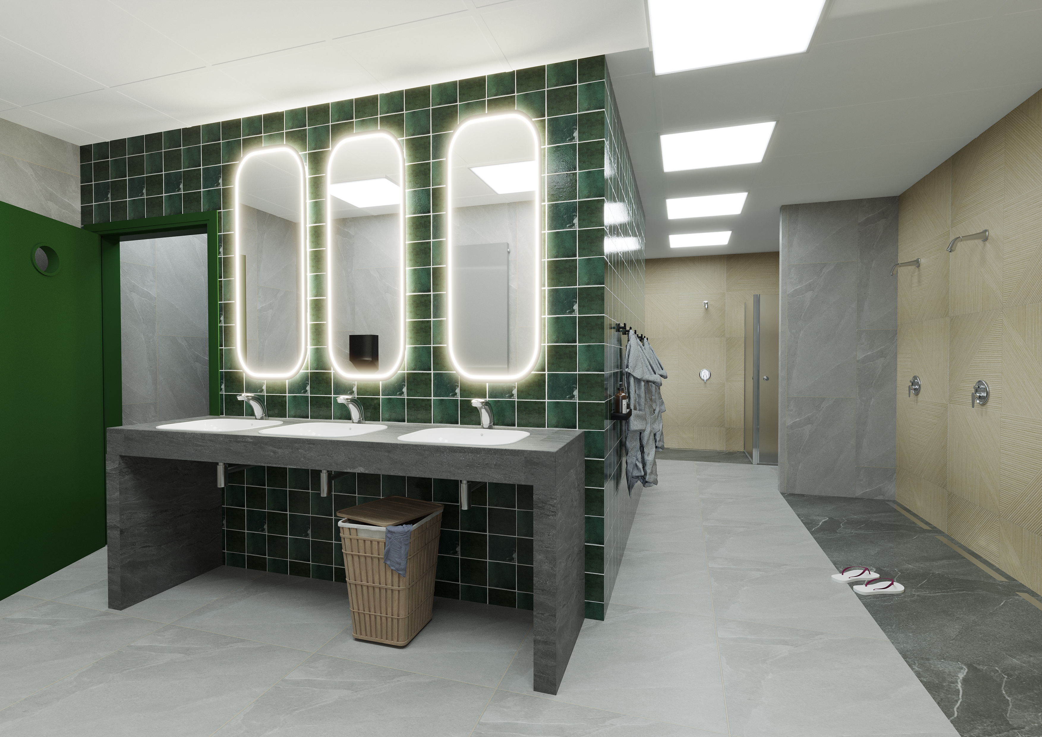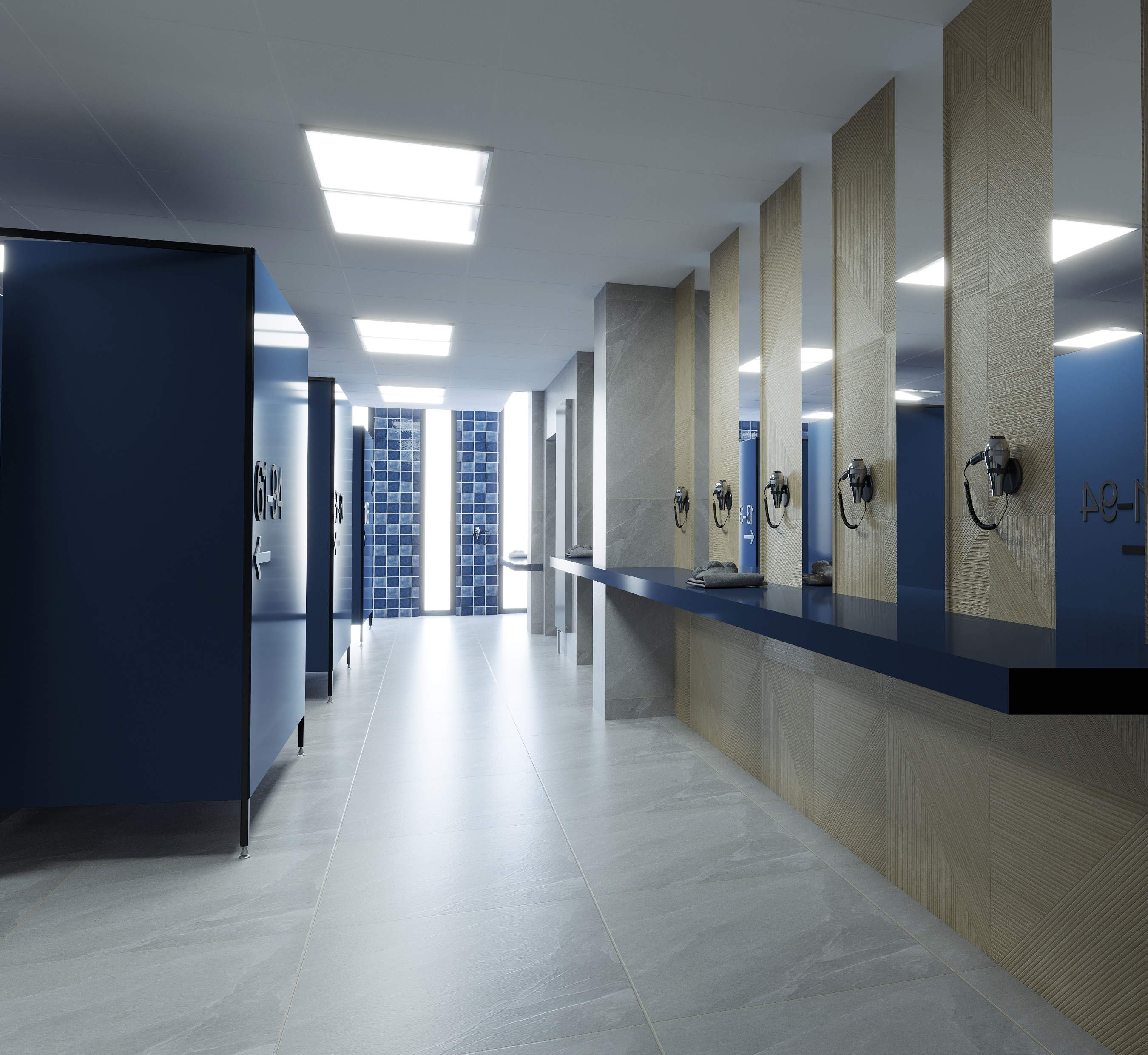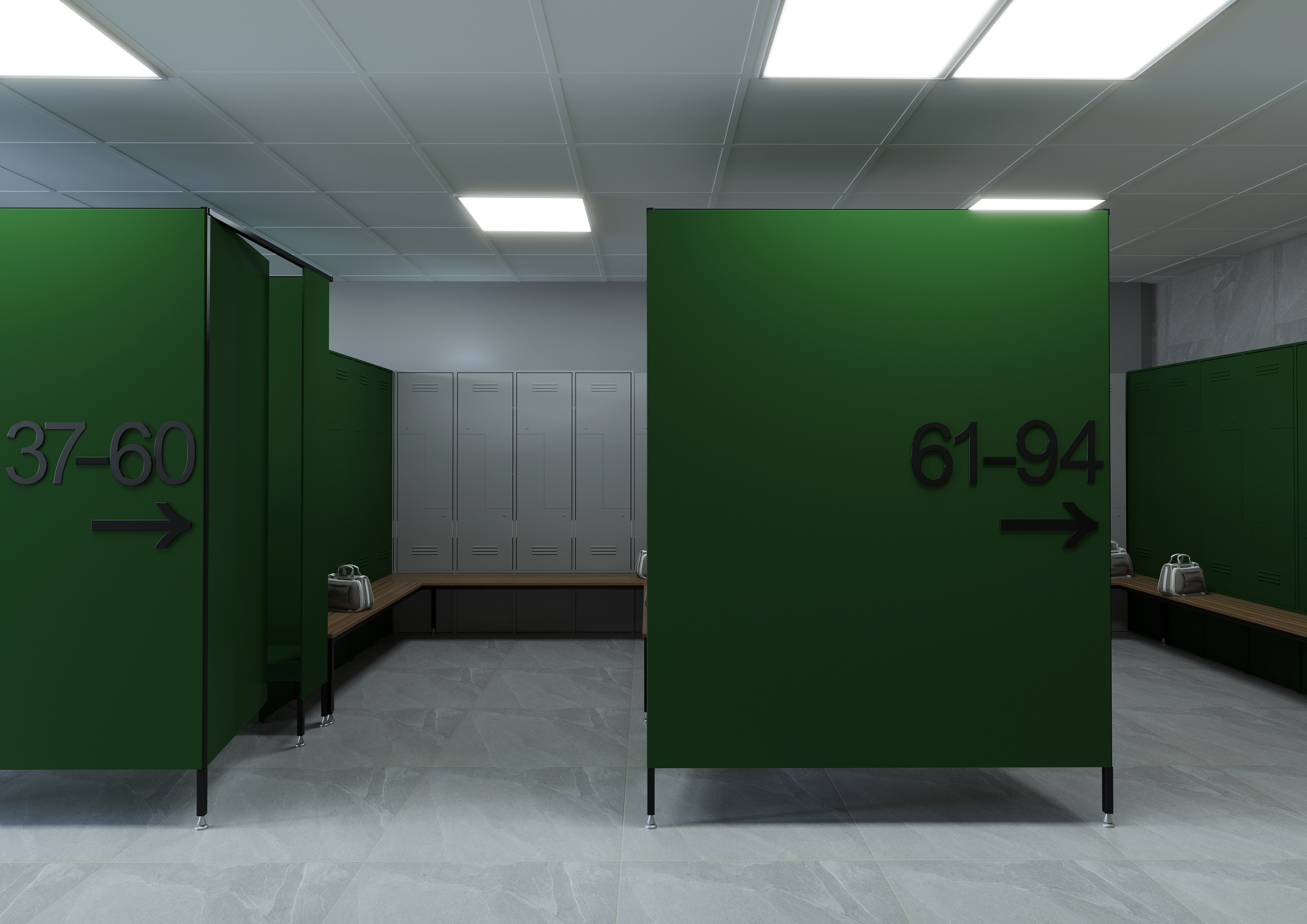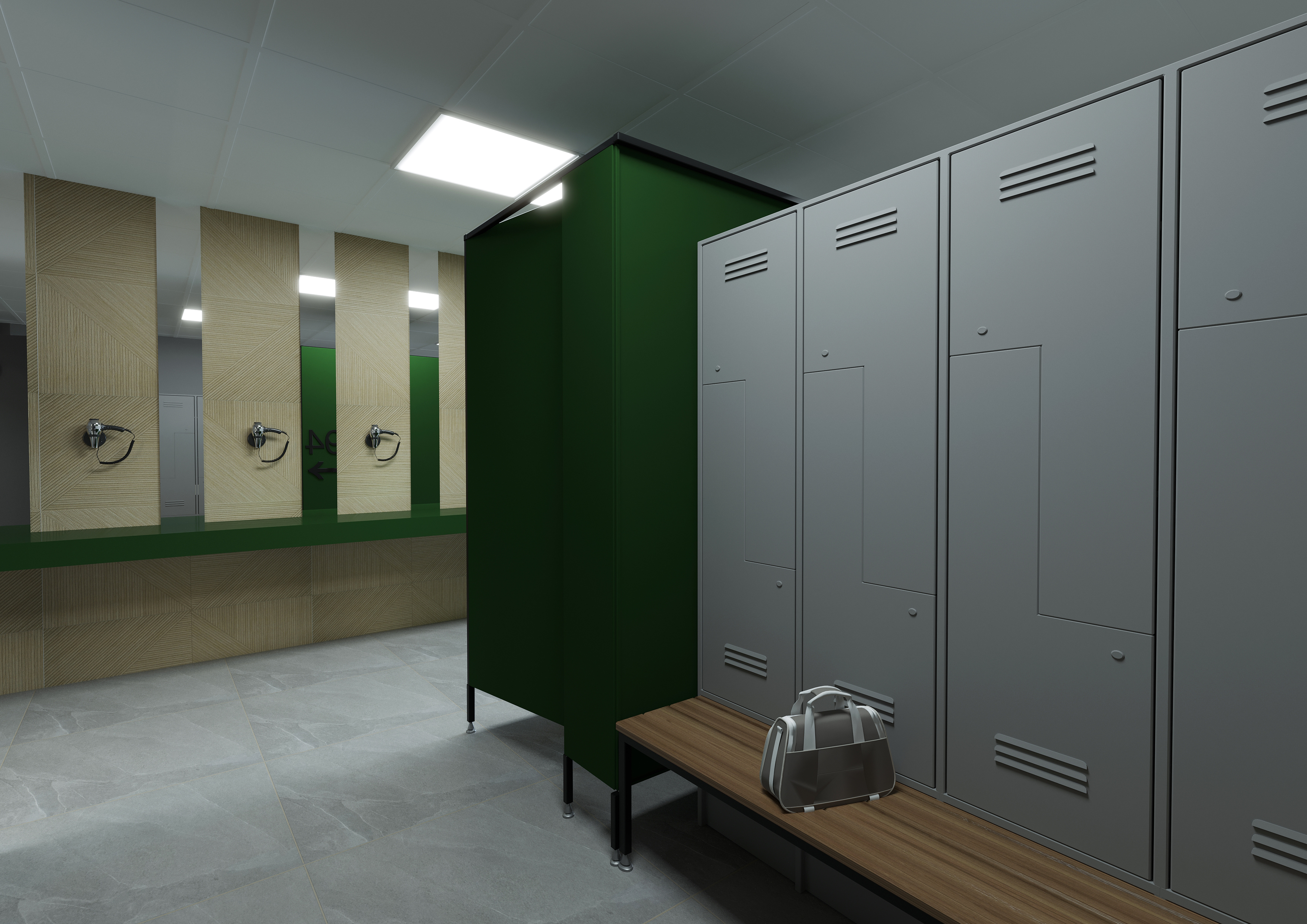 W strefie przebieralni zastosowano model kabin przechodnich z ławkami. W każdej ze stref w linii szafek umieszczono ławki z materiałów drewnopodobnych. Drzwi kabin prysznicowych wykonane zostały ze szkła dymionego, dzięki czemu są one nietransparentne.